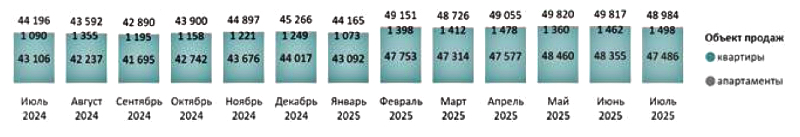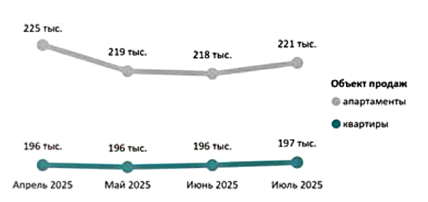 Средневзвешенная цена 1 кв. м составила 197 320 руб. (+0,4%): в квартирах — 196 750 руб. за «квадрат» (+0,3%), в апартаментах — 220 710 руб. (+1,2%).