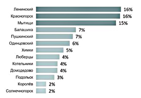 Среди округов по объему сделок лидировали Ленинский г. о. (16%), Красногорск (16%) и Мытищи (15%).