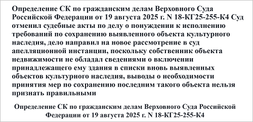 Определением №18-КГ25-255-К4 Судебной коллегии по гражданским делам Верховного Суда Российской Федерации от 19.08.2025 отменила решения нижестоящих инстанций по делу о понуждении собственника здания к проведению работ по сохранению выявленного объекта культурного наследия (ОКН).