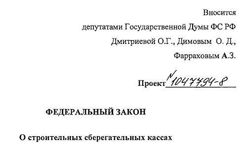 В Госдуму внесен проект Федерального закона №1047794-8 «О строительных сберегательных кассах». Положения документа предусматривают введение обновленной модели долгосрочных накоплений граждан и предоставления льготных жилищных кредитов.
