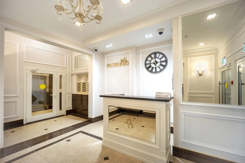 • входные группы в стиле ар-деко: качественные отделочные материалы, зеркала, световые панно, классические люстры, открытый ресепшн.