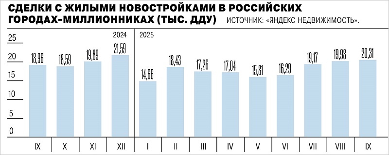 По приведенным «Коммерсантом» расчетам Яндекс Недвижимости, в сентябре в российских городах-миллионниках было реализовано 20,3 тыс. квартир (+7% за год).