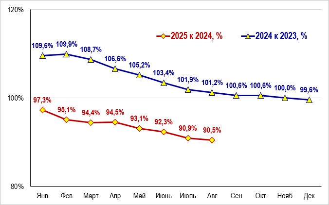 За восемь месяцев по сравнению с тем же периодом 2024 года оно сократилось на 8,5% (по результатам января — июля было -8,2%).