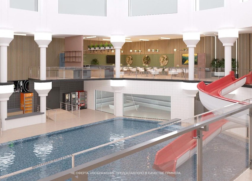 По задумке архитекторов кровля будет эксплуатируемой, на ней также планируют установить бассейн с водными горками, по которым можно будет спуститься с крыши здания. В состав комплекса войдёт большая детская зона, СПА-зона с 30 видами различных саун, бань, хаммамов, а также оздоровительная зона для взрослых.
